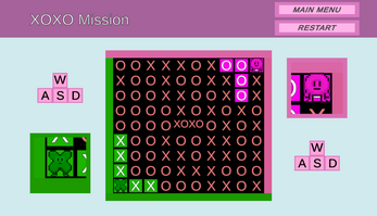 Guide both characters to the two central XO tiles at the same time in order to win.