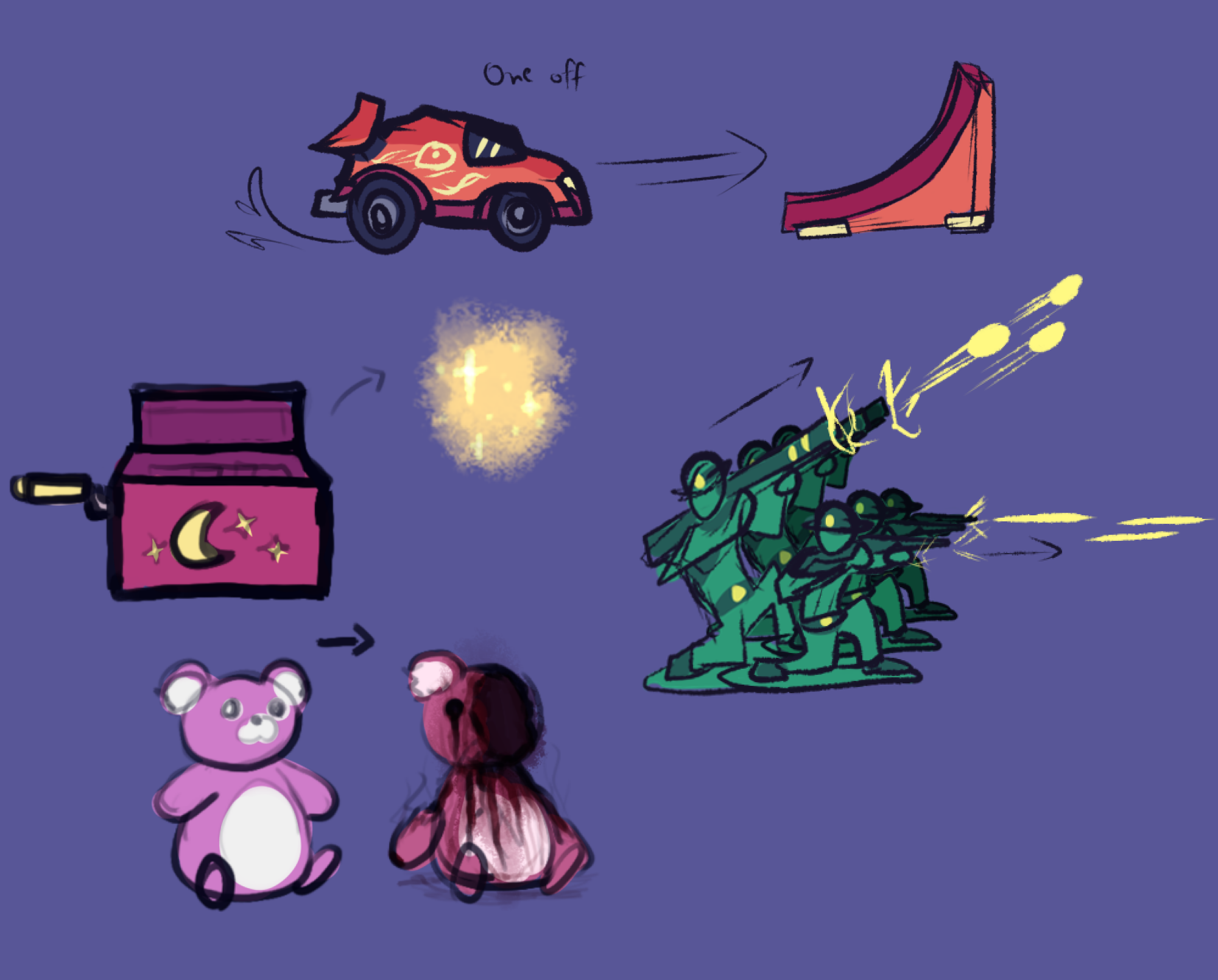 Q: Was this game inspired by Toys vs Nightmares? A: The honest answer is actually no! In fact, most of the team hadn't even heard of TvN when we started development on this project. We did eventually learn about it after people started pointing out the vibes, and yeah, it looks sick, but it wasn't an initial inspiration.