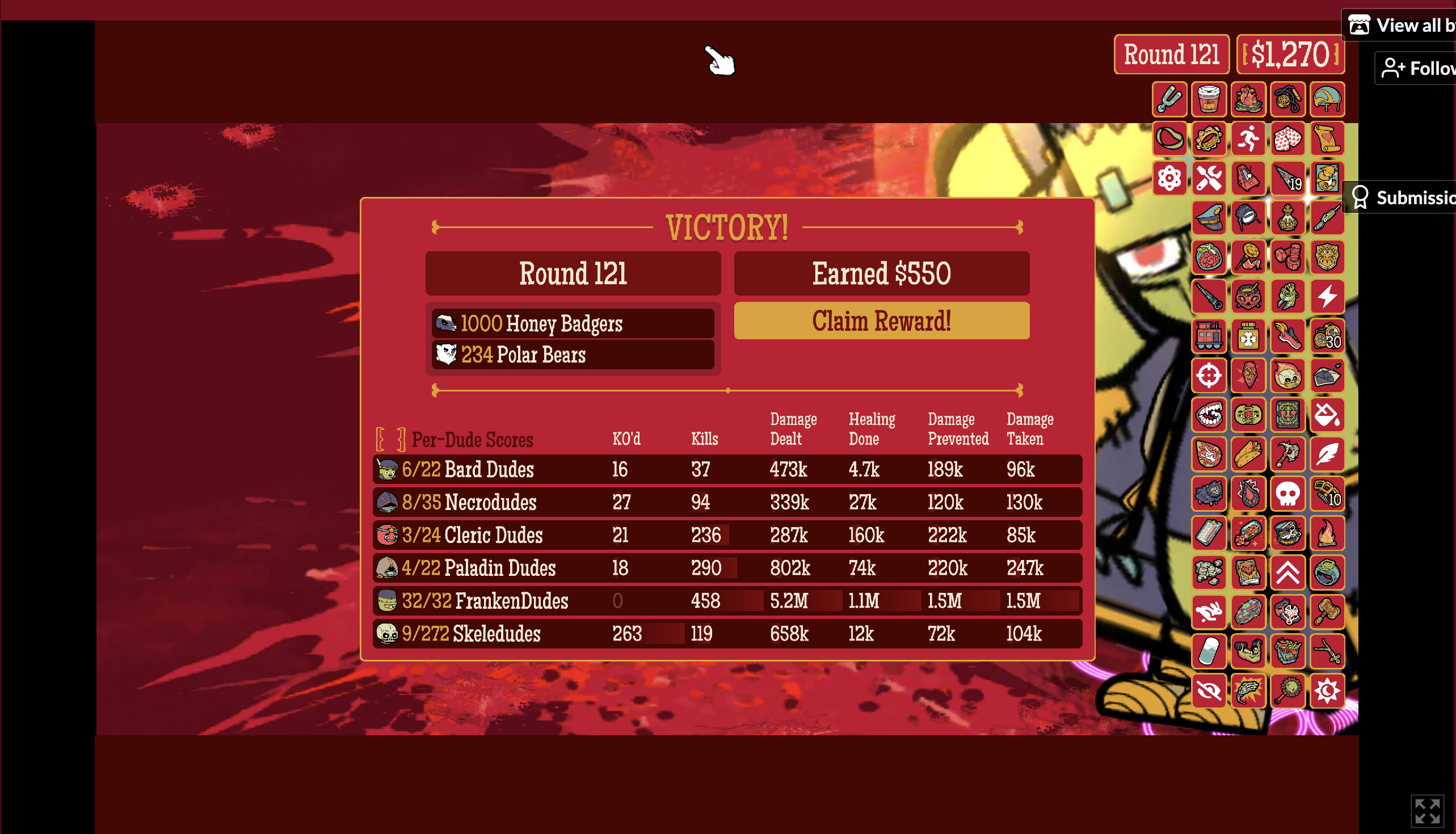 round 100, and my team is only immortal dudes and 1 ninja (and he rarely dies), i suffer in rounds with many things (200-700 enemies) because everything lags, i demolish rounds with few hard enemies, i hate bees (both big and small) and badgers, the game freezes every time i end a round and unfreezes after 10-20 seconds, gonna see how long i last against the endless boss rush