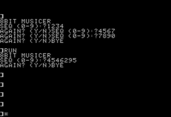 10 PRINT CHR$(4);"PR#0":PRINT CHR$(21);"8BIT MUSICER":DIM N$(1) 20 PRINT "SEQ (0-9):";:INPUT N$ 30 L=LEN(N$):IF L=0 THEN 20 40 FOR I=1 TO L:Q=ASC(MID$(N$,I,1))-48 50 F=200+Q*80:D=10+Q*3 60 FOR T=1 TO D:POKE -16336,0:POKE -16336,1:NEXT 70 NEXT 80 PRINT "AGAIN? (Y/N)";:GET A$:IF A$="Y" THEN 20 90 PRINT "BYE"