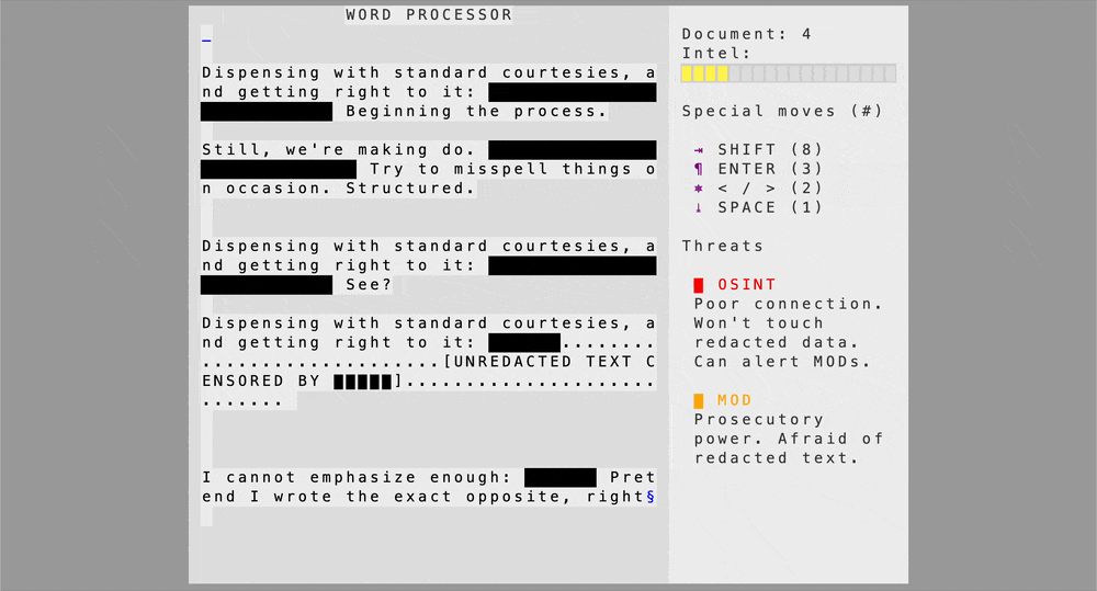 You've infiltrated the source repository of released documents with redactions in place but exposable. The problem is, you can only use a keyboard cursor. This wouldn't normally be an issue, but it turns out your OSINT peers and adversarial security personnel have access to a mouse.
