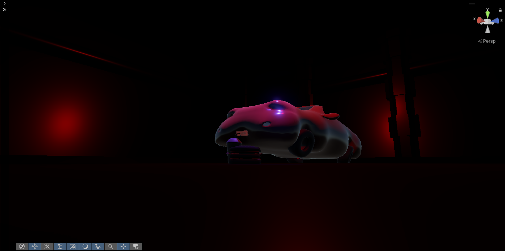 Finally, I set my car within a room styled to look a bit like MONA. In modelling the room, I tried to pay attention to unnerving design choices, like divots in the wall, pillars and floor, as well as using tangents (places where objects line up perfectly, in a sort of unnatural way, you can see this in how the pillars align with the floor divot in figure 12) for a harsh, designed edge. Lastly I imported this room into Unity, created a custom, shiny black material to "paint" it with, set up lighting and render settings and finally had my finished scene. (Figures 13, 14)