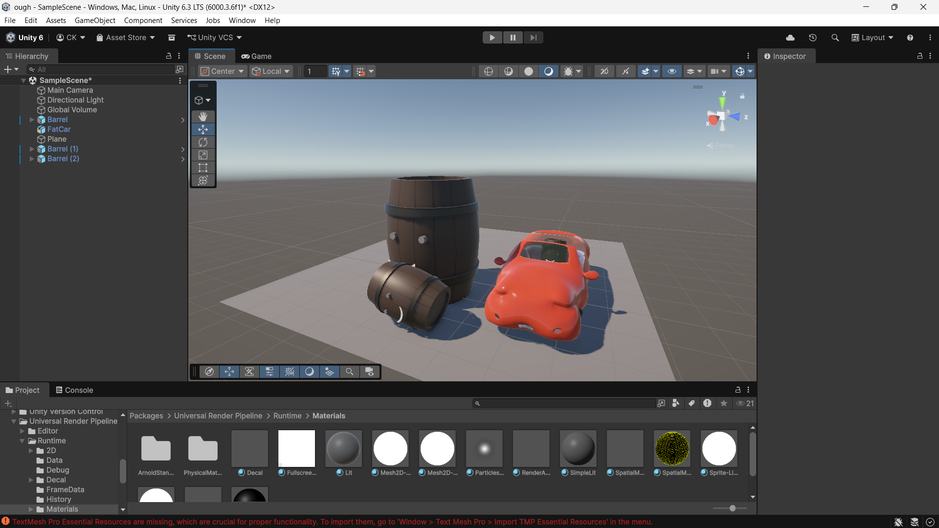 In order to place my Fat Car model into Unity, I exported it as an FBX model, then imported it into the Unity editor, setting up material files to keep the colours, textures and appearance of the car the same as they were in Blender. The barrel model was added to the scene in the same way, with Unity's prefab workflow used to create copies of the barrel that would each change with adjustments made to the barrel prefab object.