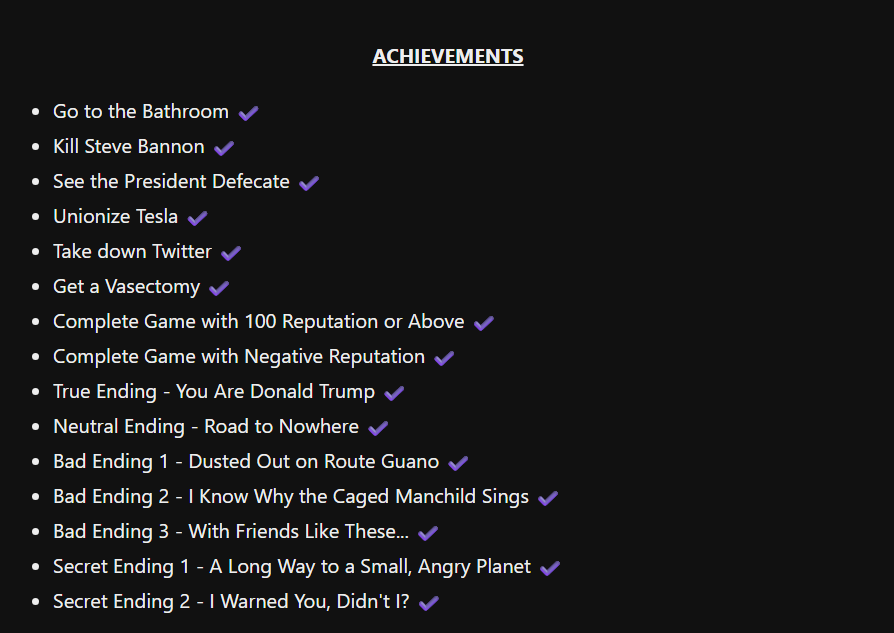 Glad it helped! I've got all achievements and endings now. I'm not sure how or when I got "See the President Defecate" but it's quite possible I skimmed past it thinking it was duplicate text while looking for endings. Great game! The sequel you've teased in the true ending terrifies me.