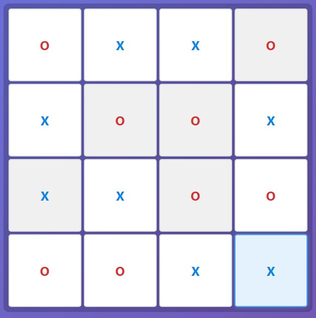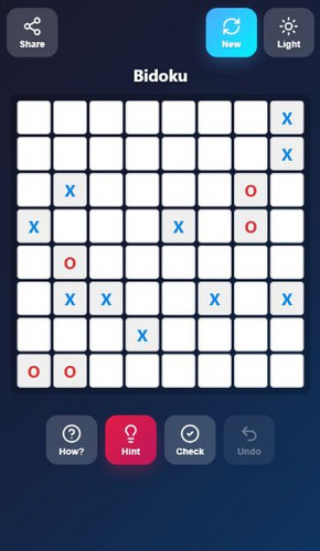 - Rule 2. Balance. Each row and each column must have equal numbers of ✖️'s and ⭕'s.