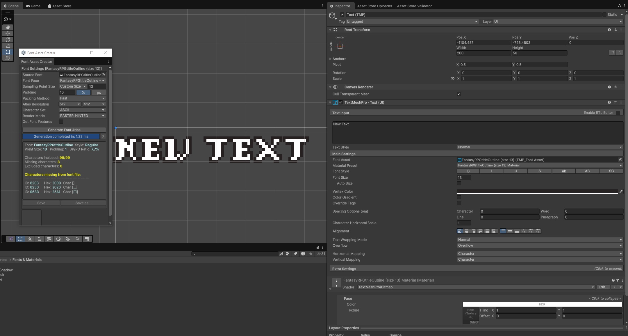 For alignment, I found that both fonts should have the same X position, but the outline should be placed 1px higher on Y axis. So, if "FantasyRPGtitle" Pos Y is 4, then "FantasyRPGtitleOutline" should be at 5. This way they align perfectly. Not sure why this is needed, since I created them in the same size and grid...