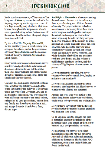 SOULBLIGHT - HAMARTIA is the third expansion for the Soulblight-Setting, written and designed for Shadowdark RPG. It takes you to the Islands of Hamartis, an archipelago just off the coast of Verocia, a region inspired by the Mediterranean sea and the Reconquista period. Convicted by the paranoid justice of His Majesty King Velasco III, you are delviered unto the penal colony on the central island, where prison gangs fight for every scrape of territory and resources thrown their way by the draconic guards. Can you survive long enough and gain allies for an escape? Do you take the injustice done to you to heart and throw your lot in with the Rebel, taking to Verocia's streets with fire and flame? Do you take to the seas and a life of piracy? Or do you succumb to the call of the coral and its imprisoned god, below Hamartis...