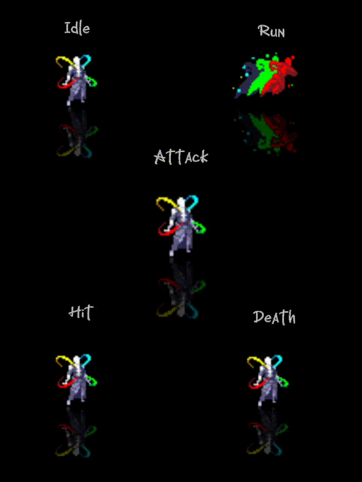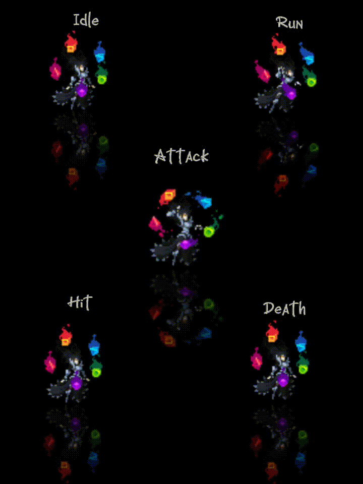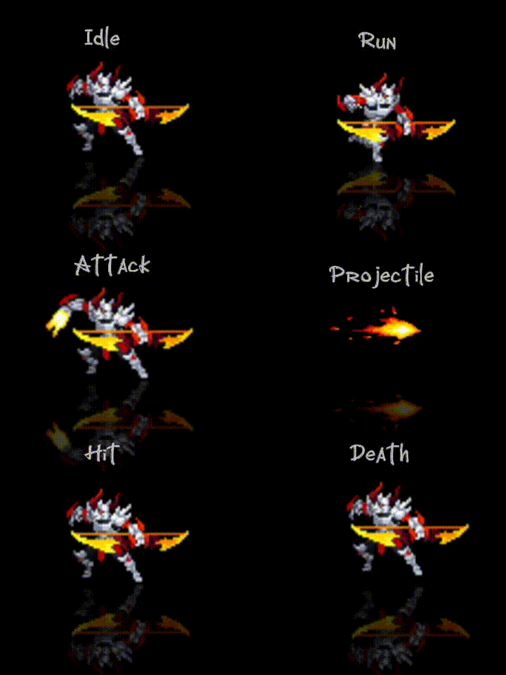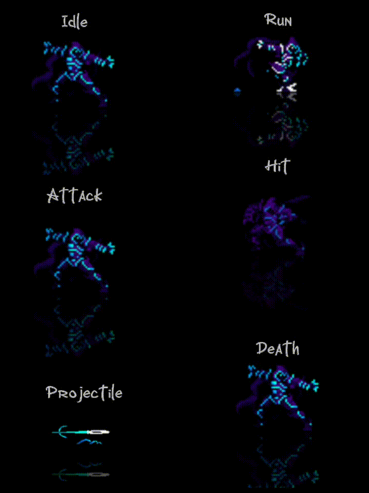 - Each character has at least 5 animations: idle, run, attack, hit, and death.