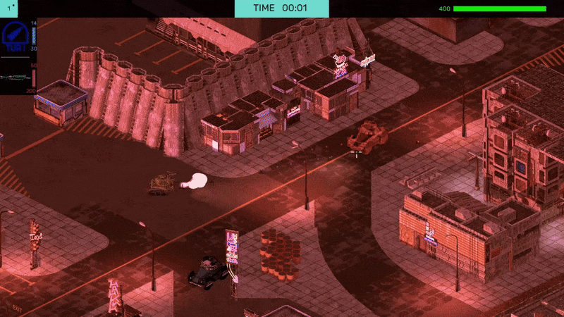 - Drive around rich detailed sprite environments in vehicles like clapped-out sedans, tanks or bipedal mechs.