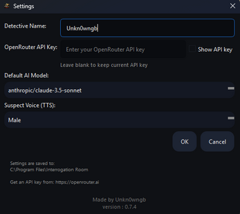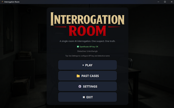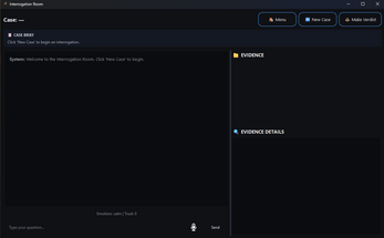 You play as a detective, receive a freshly generated case file, then interrogate a suspect in real time. No scripted dialogue loops — the suspect reacts dynamically to how you question them, and your choices directly shape the flow and outcome of the conversation.