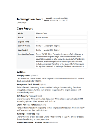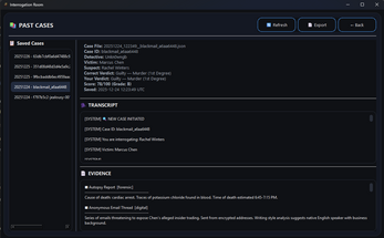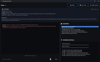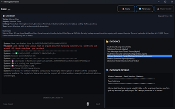 Every case is designed to feel different: new victims, suspects, locations, evidence, timelines, and twists — all generated on demand. No two interrogations play out the same.